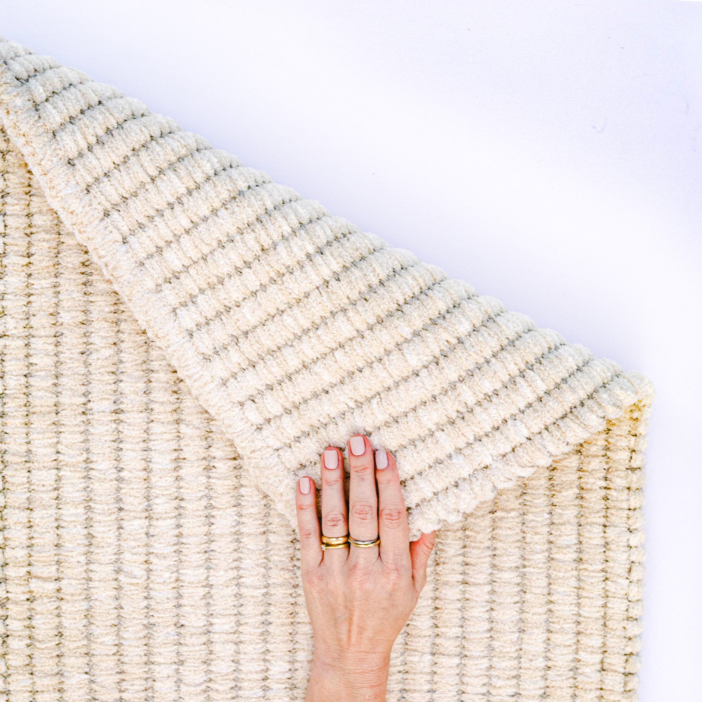 Feito de forma artesanal no tear em Minas Gerais, o tapete é confeccionado com fibras naturais de chenille off-white e sisal prata, oferecendo um equilíbrio perfeito entre suavidade e rusticidade.