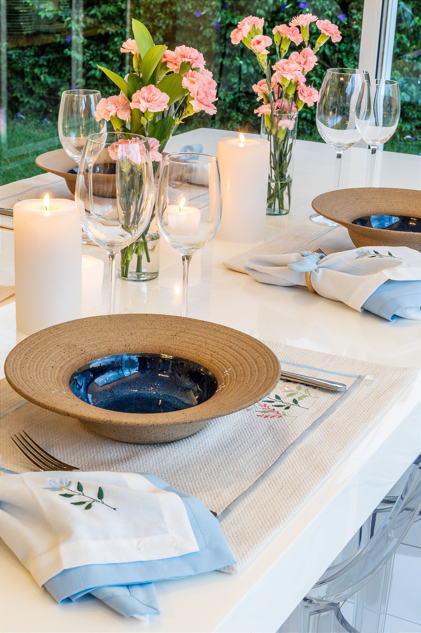 Para criar uma mesa ainda mais encantadora, sugerimos a combinação com dois guardanapos: um liso e outro bordado com delicadas flores. Finalize com o Porta-Guardanapo Laço Azul, que harmoniza perfeitamente com os detalhes em recortes e linhas, trazendo um toque especial à composição.