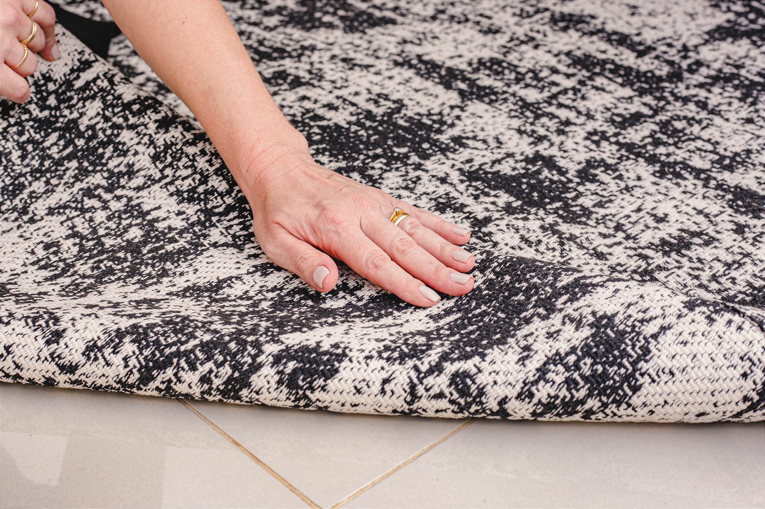 Produzido em tear industrial com fio natural de algodão, ele é leve, fino e tem um toque suave, além de ser lavável na máquina, o que facilita o uso no dia a dia. Sua combinação de cores cria um contraste marcante que delimita o espaço com elegância, destacando o chão de forma única.